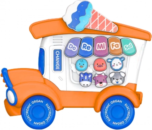 Vesela pianină educativă în formă de camionetă de înghețată atrage copiii de la prima vedere. Oferă clape cu tonurile Do–Re–Mi–Fa–Sol, efecte sonore drăgălașe și melodii care dezvoltă auzul, ritmul și coordonarea. Construcția rezistentă din materiale sigure și culorile vii susțin un joc plin de bucurie și stimulare.