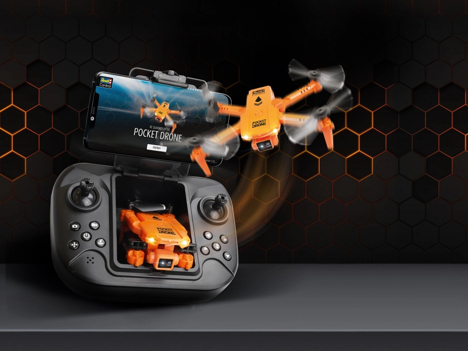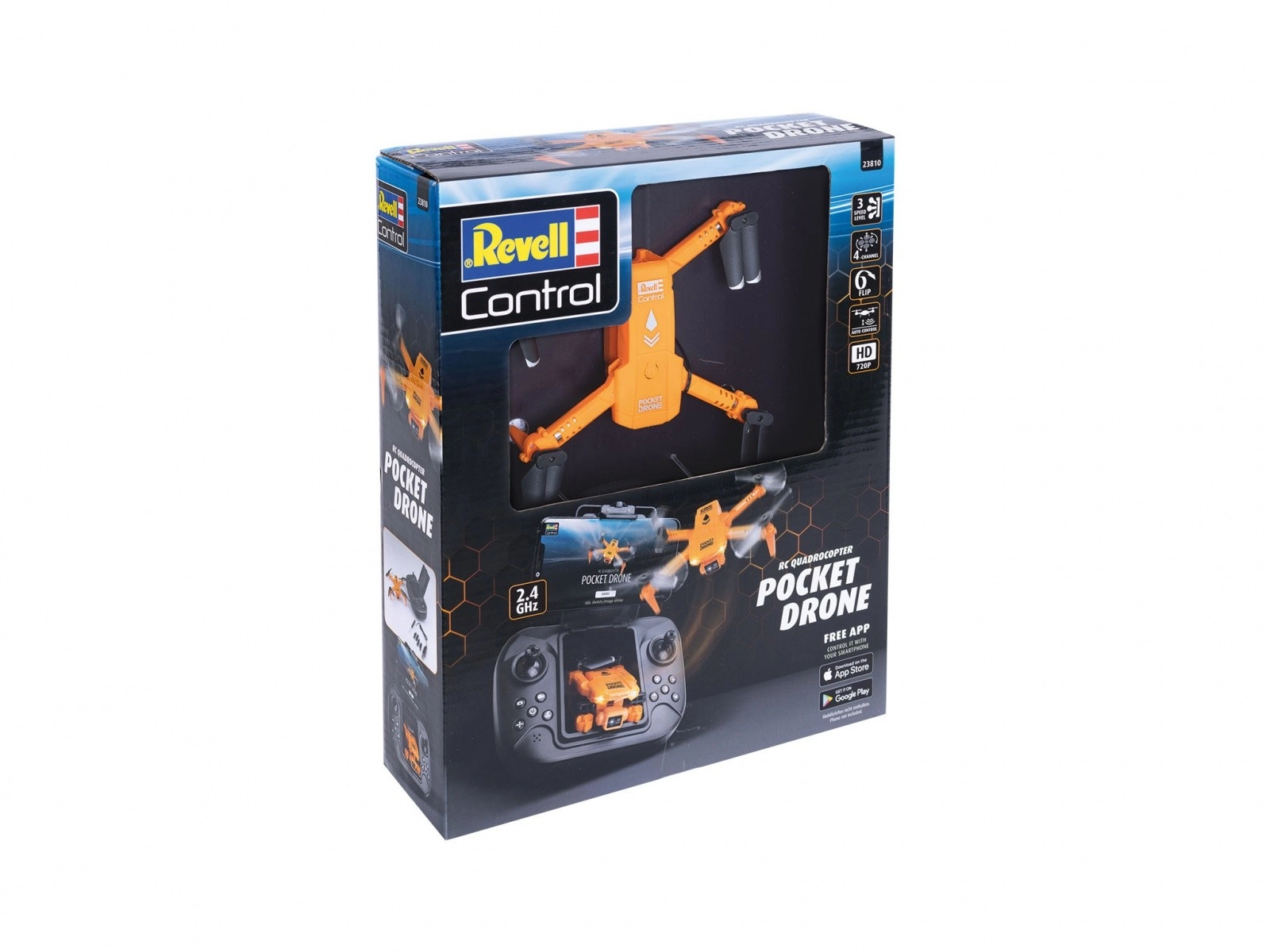 Drona de buzunar REVELL Control aduce multă distracție într-un corp mic. Cu o lungime de 110 mm, lățime de 134 mm și înălțime de 35 mm, încape comod în compartimentul telecomenzii și este mereu gata de zbor. Camera integrată 720p transmite în timp real imagini și videoclipuri de bază către smartphone-ul dvs., astfel încât să vedeți lumea dintr-o nouă perspectivă.