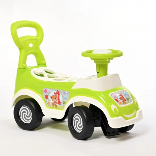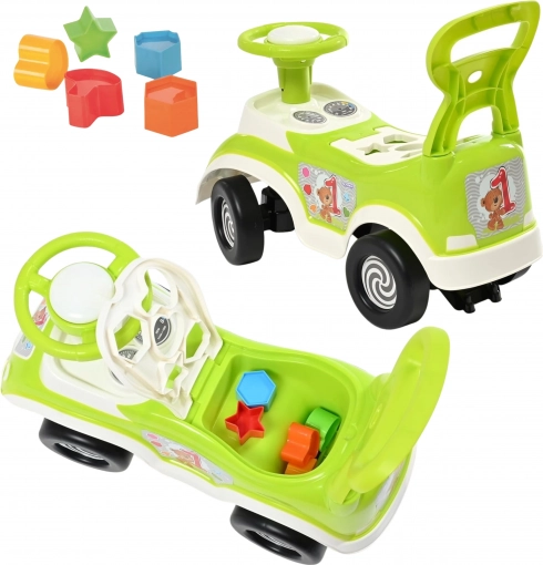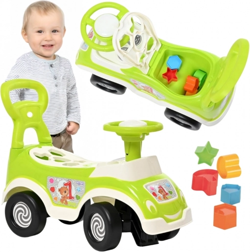 Un ajutor universal pentru primii pași și pentru deplasare independentă. Copilul poate merge călare, se poate sprijini de spătar la mers și poate învăța formele datorită sortatorului încorporat.