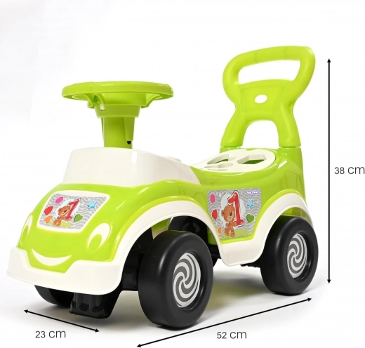 Accentul pe siguranță și stabilitate este completat de ecartamentul lat al roților, marginile netede și materialele durabile, fără a fi nevoie de baterii. Volanul colorat cu claxon și panoul cu „ceasuri” îi introduc pe copii în lumea condusului și le dezvoltă simțul echilibrului, coordonarea și autonomia.