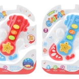 Chitară din plastic, distractivă, pentru cei mai mici muzicieni, oferă efecte luminoase și sunete la apăsarea butoanelor. Datorită dimensiunilor compacte, se ține ușor în mâini mici și este ideală pentru dezvoltarea motricității și a simțurilor. Alimentarea este asigurată de 2 baterii AAA, care sunt incluse în pachet.