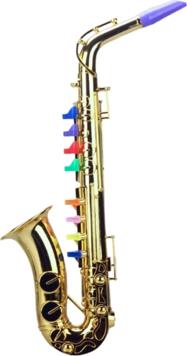 Saxofonul pentru copii, în elegantul finisaj auriu cu clapete colorate, atrage privirea de la primul contact și se ține excelent în mâini. Mecanismul fără baterii este sigur, ecologic și mereu gata de cântat – este suficient să sufli și să apeși clapele.
