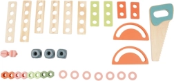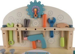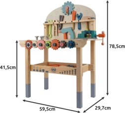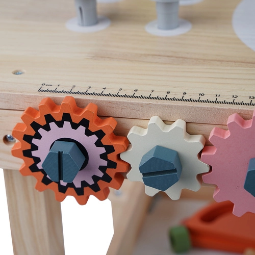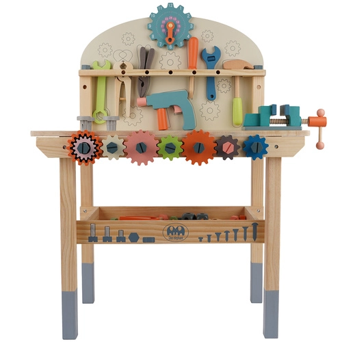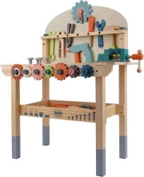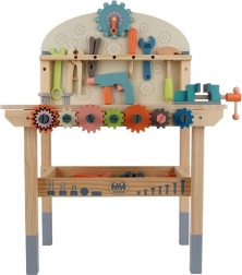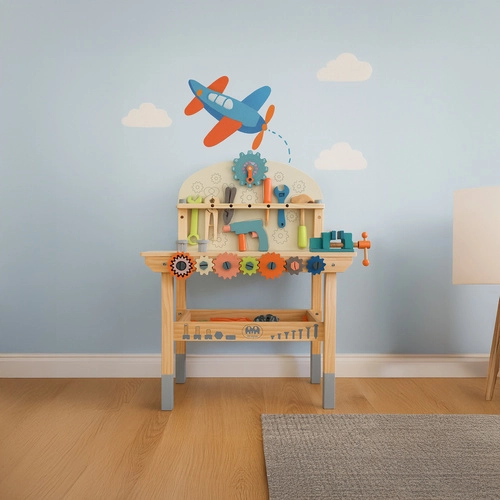Pachetul include un set bogat de unelte și elemente de îmbinare, care dezvoltă motricitatea fină, coordonarea ochi–mână și gândirea logică. Raftul inferior practic oferă spațiu pentru depozitarea componentelor și accesoriilor. Un cadou grozav care va încânta orice mic pasionat de bricolaj.