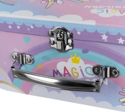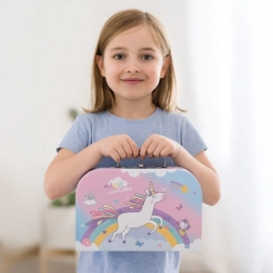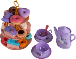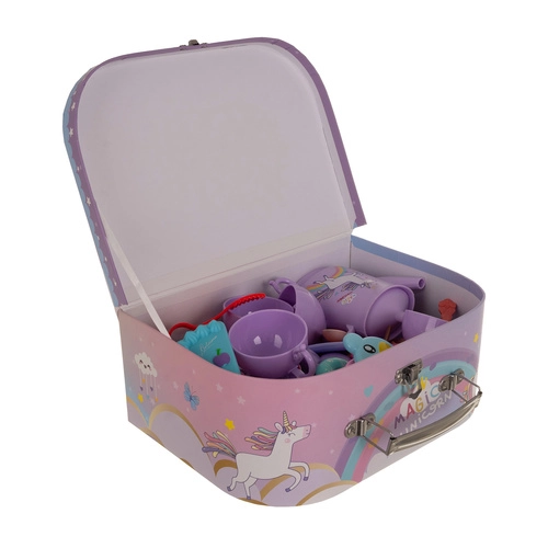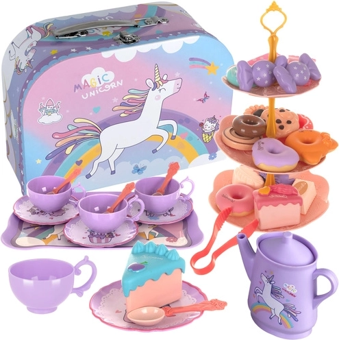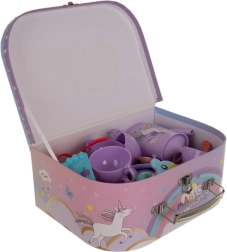 Adorabilul set de ceai pentru copii, într-o valiză practică, va încânta orice mic gazdă. Conține ceainic, cești, farfurioare, tavă, suport etajat cu trei niveluri pentru dulciuri și 21 de delicatese. Datorită materialelor de calitate este rezistent la crăpare și zgârieturi, susține jocul creativ și dezvoltarea abilităților sociale, iar suprafața netedă se curăță ușor.