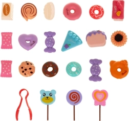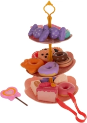 Conținutul pachetului: valiză cu mâner și închidere metalică, suport etajat cu trei niveluri pentru dulciuri, ceainic cu capac, 4 cești, 4 farfurioare, 4 lingurițe decorative, cleștișori, tavă de servire, 21 de bunătăți (bomboane, gogoși, macarons, biscuiți), instrucțiuni de utilizare, cutie de transport maro.