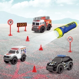 Acest set SOS micro aduce o acțiune de salvare completă în camera copilului. Trei vehicule mini detaliate, cu rulare liberă – mașină de pompieri, mașină de poliție și ambulanță – sunt ideale pentru joacă creativă și exersarea situațiilor din trafic. Pachetul include, de asemenea, indicatoare rutiere și o lanternă practică cu trei funcții de iluminare, care oferă jocului autenticitate.