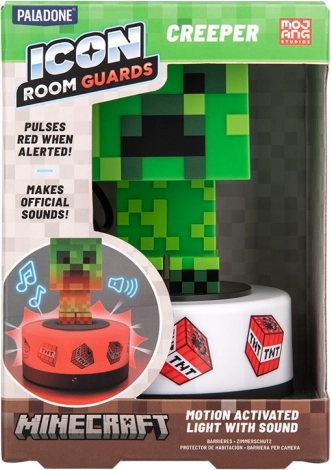 Lampă de noapte stilată în forma CREEPERULUI din MINECRAFT, care iluminează camera copilului cu o liniște verde sau cu o funcție roșie de pază. Oferă două moduri de iluminare, activare la mișcare și redă sunet oficial. Alimentare cu baterii AAA (nu sunt incluse).