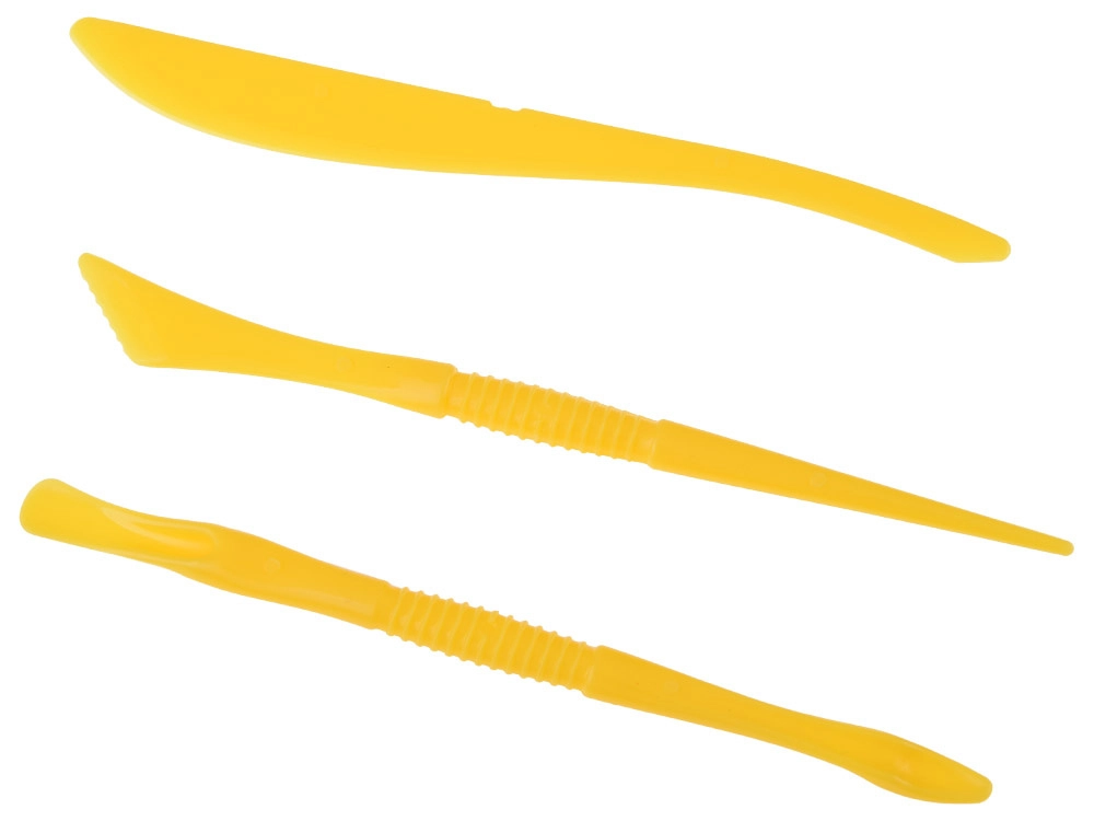 În pachet se găsesc și 3 cuțitașe din plastic sigure pentru îndepărtarea precisă a surplusului și finisarea detaliilor. Pe ambalaj vei găsi un ghid color util care indică ce culori rezultă prin combinarea diferitelor mase.