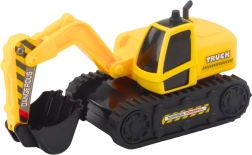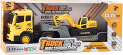Set realist cu camion cu platformă și excavator pe șenile la scară 1:16, care oferă ore de distracție pentru micii pasionați de utilaje de construcții. Vehiculul are propulsie Friction Power pentru pornire lină, efecte luminoase și sonore și o platformă cu rampă rabatabilă. Excavatorul se rotește 360°, iar cupă se controlează cu o manetă laterală – totul din plastic de calitate, sigur.