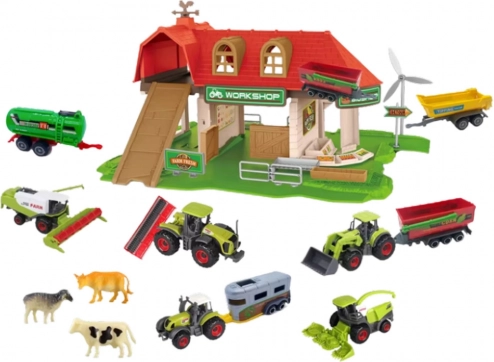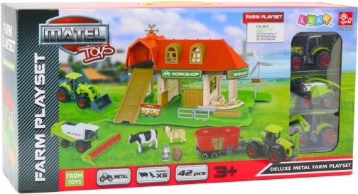 - Echipare bogată: hambar cu accesorii, moară de vânt, țarcuri și indicatoare, 2 tractoare cu remorci, figurine de animale domestice.