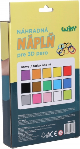Set de 15 rezerve colorate pentru pix 3D WIKY, fiecare de 3 m. Utilizare ușoară, ambalaj în limba cehă, excelent pentru proiecte creative și modelare.