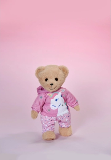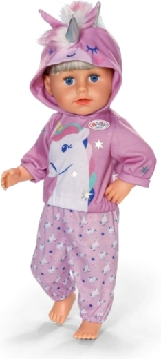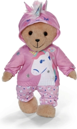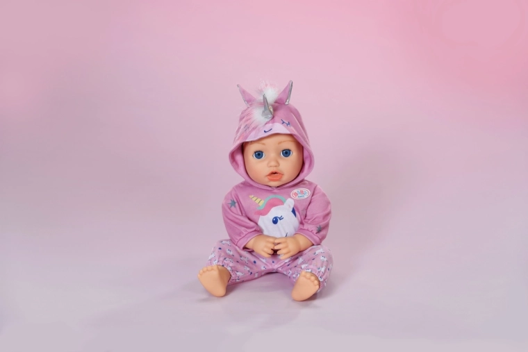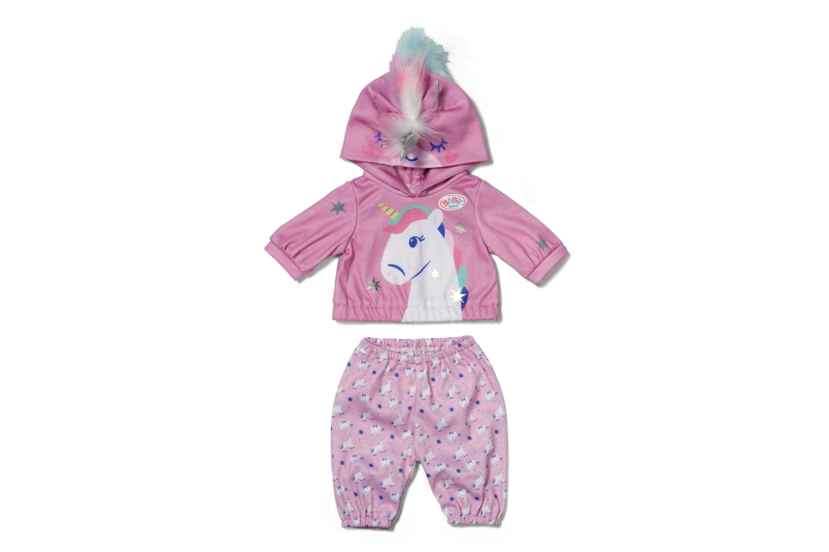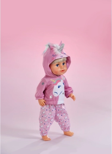 Ținuta stilată cu unicorn transformă orice păpușă într-un prieten de poveste. Hanoracul moale cu glugă cu corn și urechiușe, împreună cu pantalonii asortați cu model cu unicorni, sprijină joaca creativă, povestirea și dezvoltarea motricității fine datorită îmbrăcării simple.
