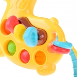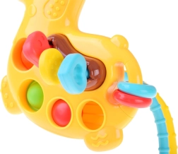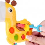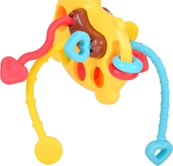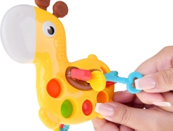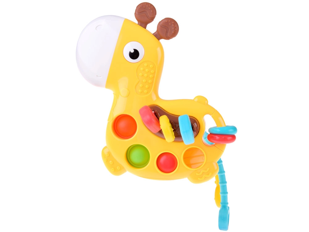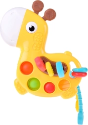Mini girafa oferă o stimulare senzorială bogată: copilul poate apăsa bulele pop it, glisa mărgele sau trage proeminențele moi prin corpul girafei. Materialul moale și sigur masează delicat gingiile și ajută la erupția dinților, în timp ce efectele coloristice și sonore susțin concentrarea și curiozitatea.