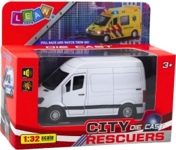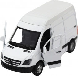 Furgonetă metalică realistă la scară 1:32, care îi va încânta pe micii și marii pasionați. Oferă mecanism pull back cu arc, uși care se deschid și efecte luminoase și sonore. Combinația de metal și plastic de calitate garantează durabilitate, iar designul alb, minimalist, se potrivește în orice colecție de modele.