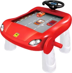 Simulatorul de condus roșu, sub forma unei măsuțe stilate, amintește de partea frontală a unei mașini sport și impresionează imediat prin designul său expresiv. Copiii controlează mașinuțele cu ajutorul comandului rotativ manual și al volanului, evită obstacolele și își antrenează gândirea logică și viteza de reacție. Datorită execuției robuste din plastic, jucăria este stabilă, rezistentă și ideală pentru joaca zilnică fără a necesita baterii.