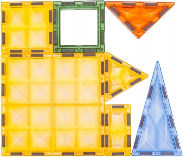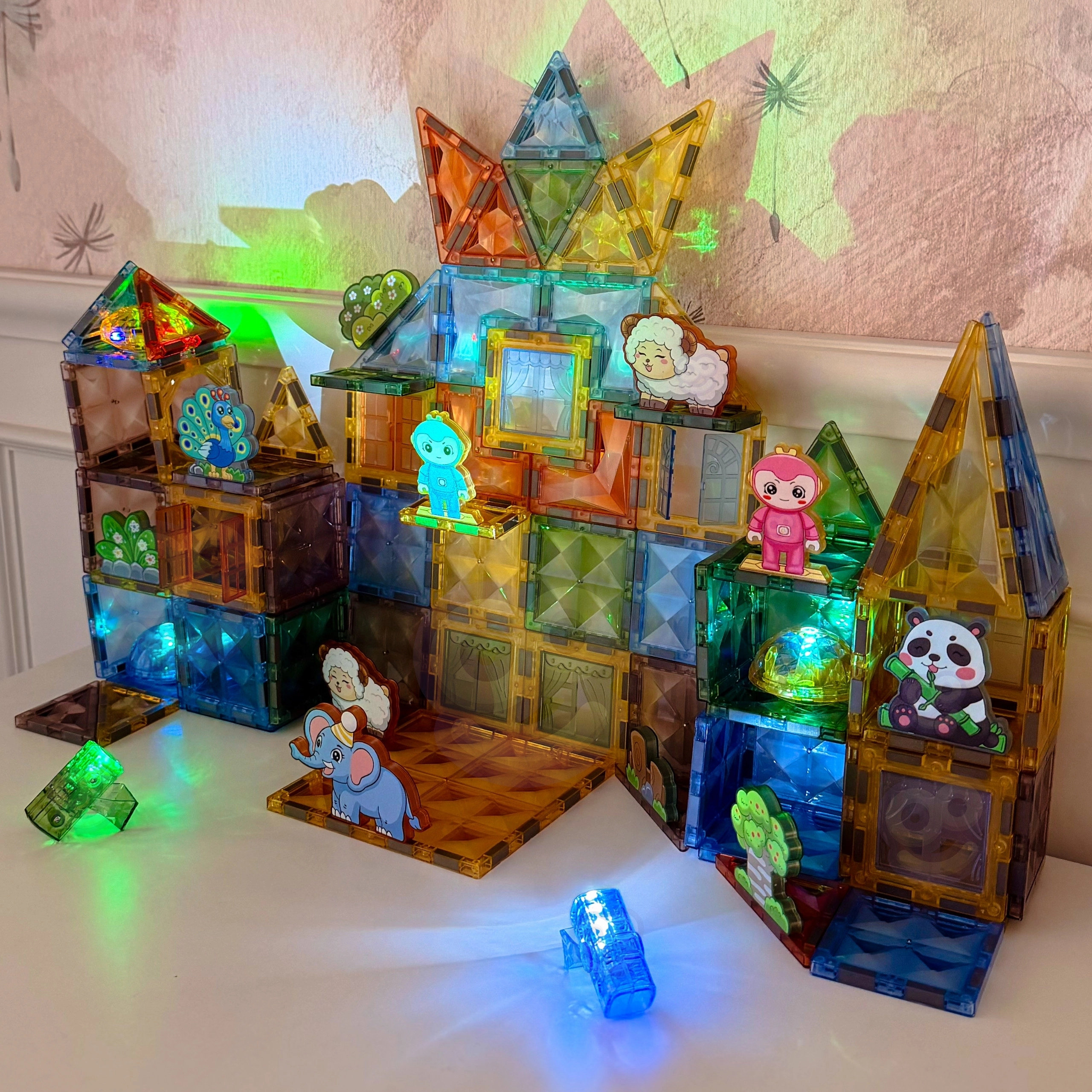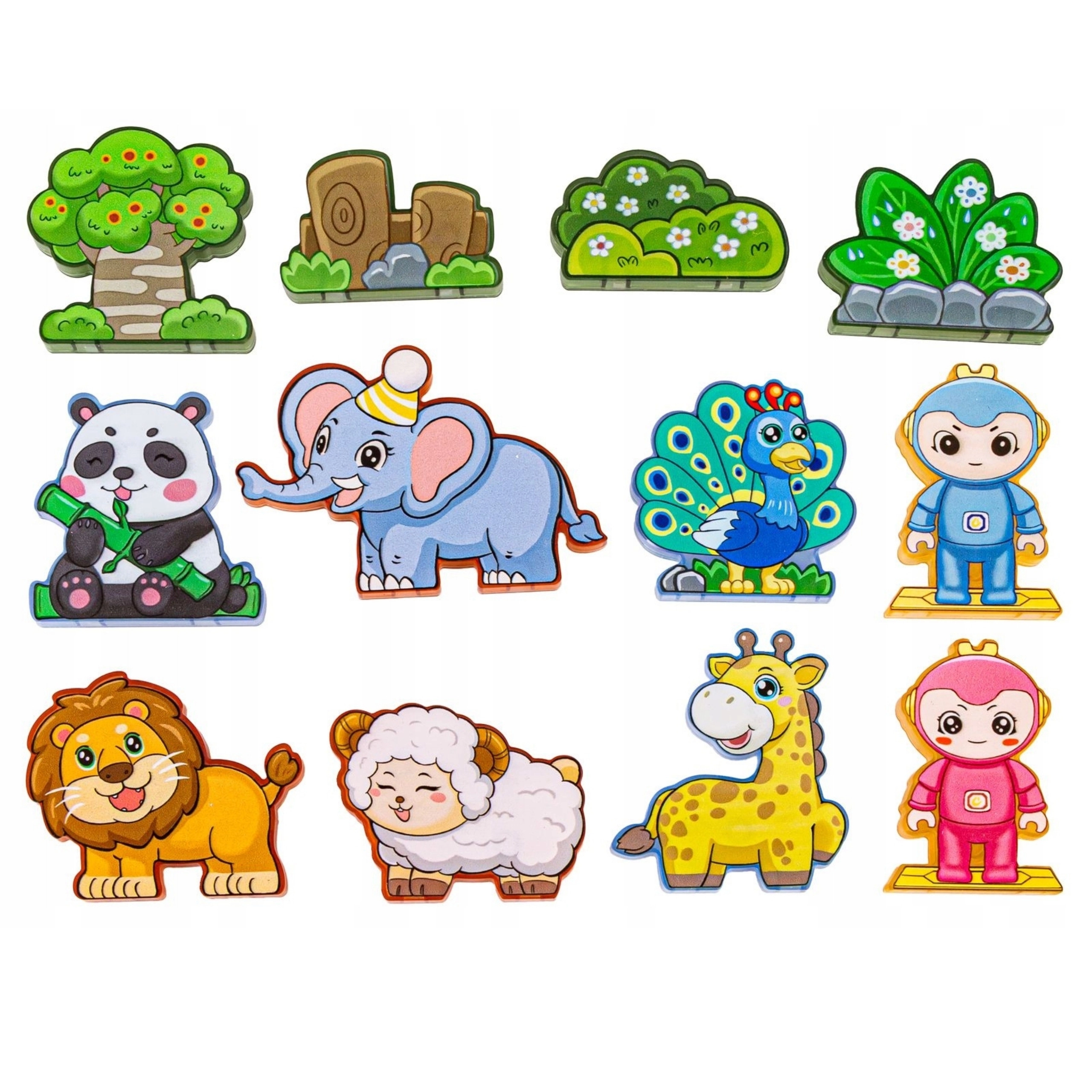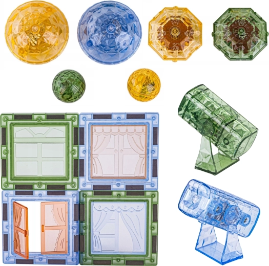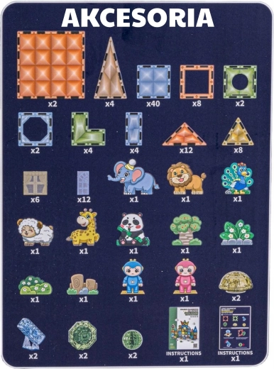 - Piese variate: forme magnetice, figurine de animale și personaje, accesorii tematice (copac, stânci).