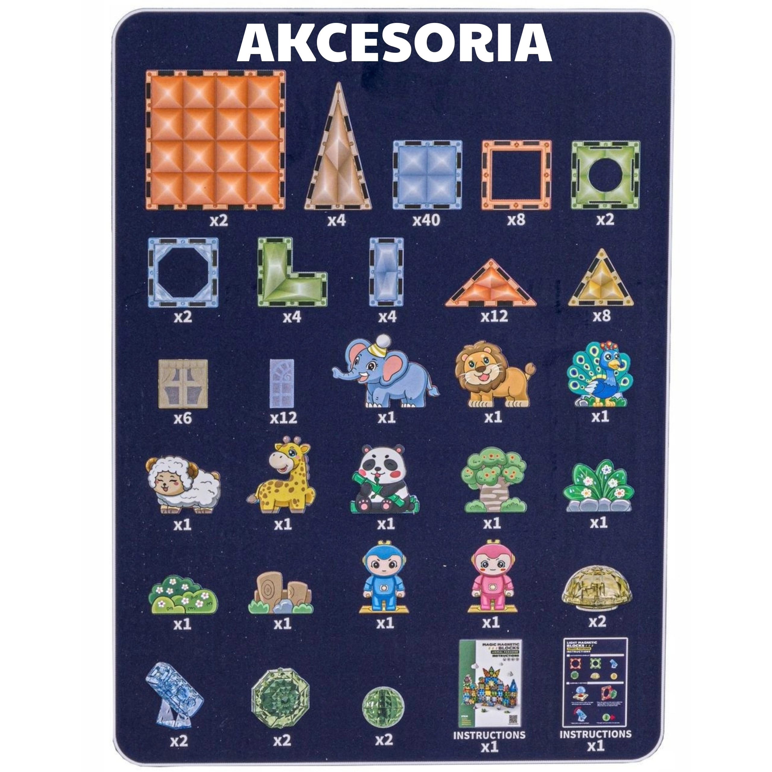 - Piese magnetice de forme diferite, figurine de animale, figurine personaje, accesorii tematice (copac, stânci), ghid