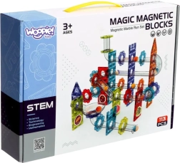 Descoperă lumea creativității cu setul de construcție magnetic 3D WOOPIE cu 113 piese, care combină o pistă cu bile și construcții spațiale. Plăcile magnetice transparente și elementele colorate oferă ore de distracție, dezvoltă gândirea logică, imaginația spațială și motricitatea fină, și în același timp predau bazele fizicii și ale gravitației.