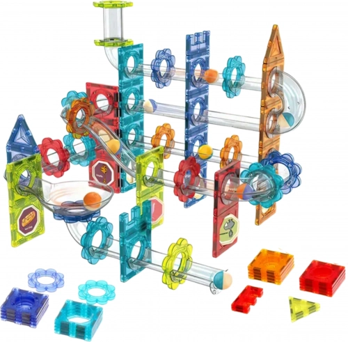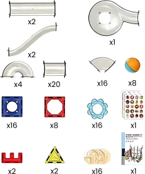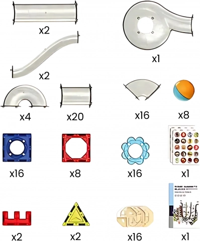 - Piese magnetice în diferite forme și culori; părți transparente ale pistei (jgheaburi, curbe, pâlnii, tuneluri); bile colorate; autocolante decorative; instrucțiuni ilustrate