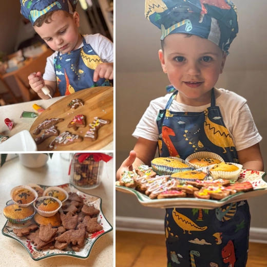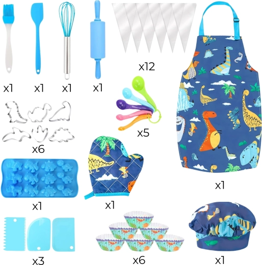 Tot ce au nevoie copiii pentru copt și decorat: sucitor, tel, spatulă, pensulă din silicon, linguri de măsurare, forme pentru biscuiți, săculețe pentru decorat, coșulețe, raclete și o formă din silicon pentru mini dinozauri.