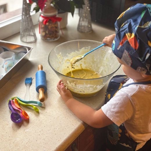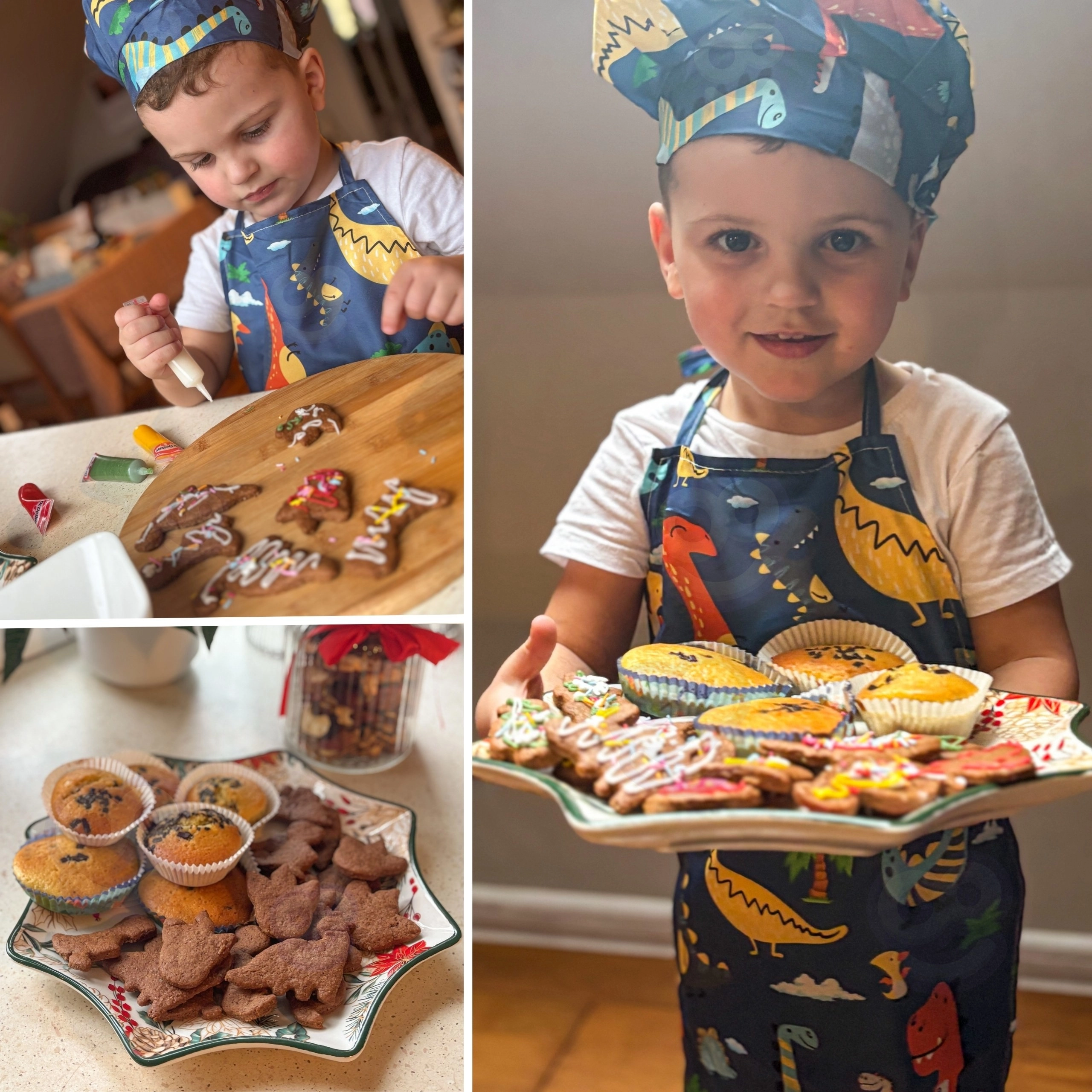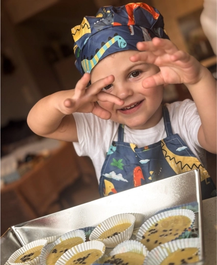 Șorț cu gât reglabil, bonetă cu elastic și mănușă de bucătărie care protejează hainele și mâinile. Dimensiune ideală pentru copii și întreținere ușoară – șorțul și boneta pot fi spălate la mașină.