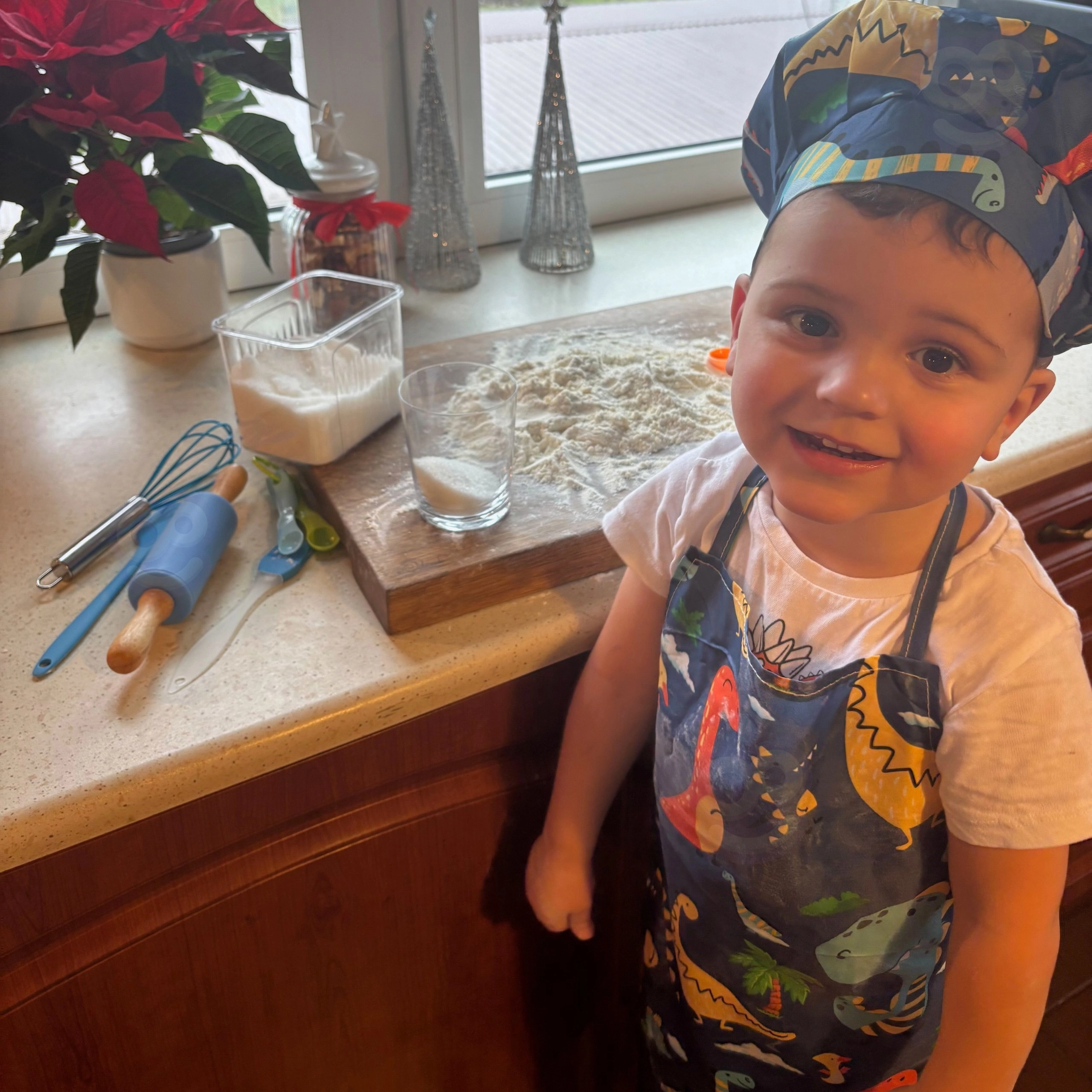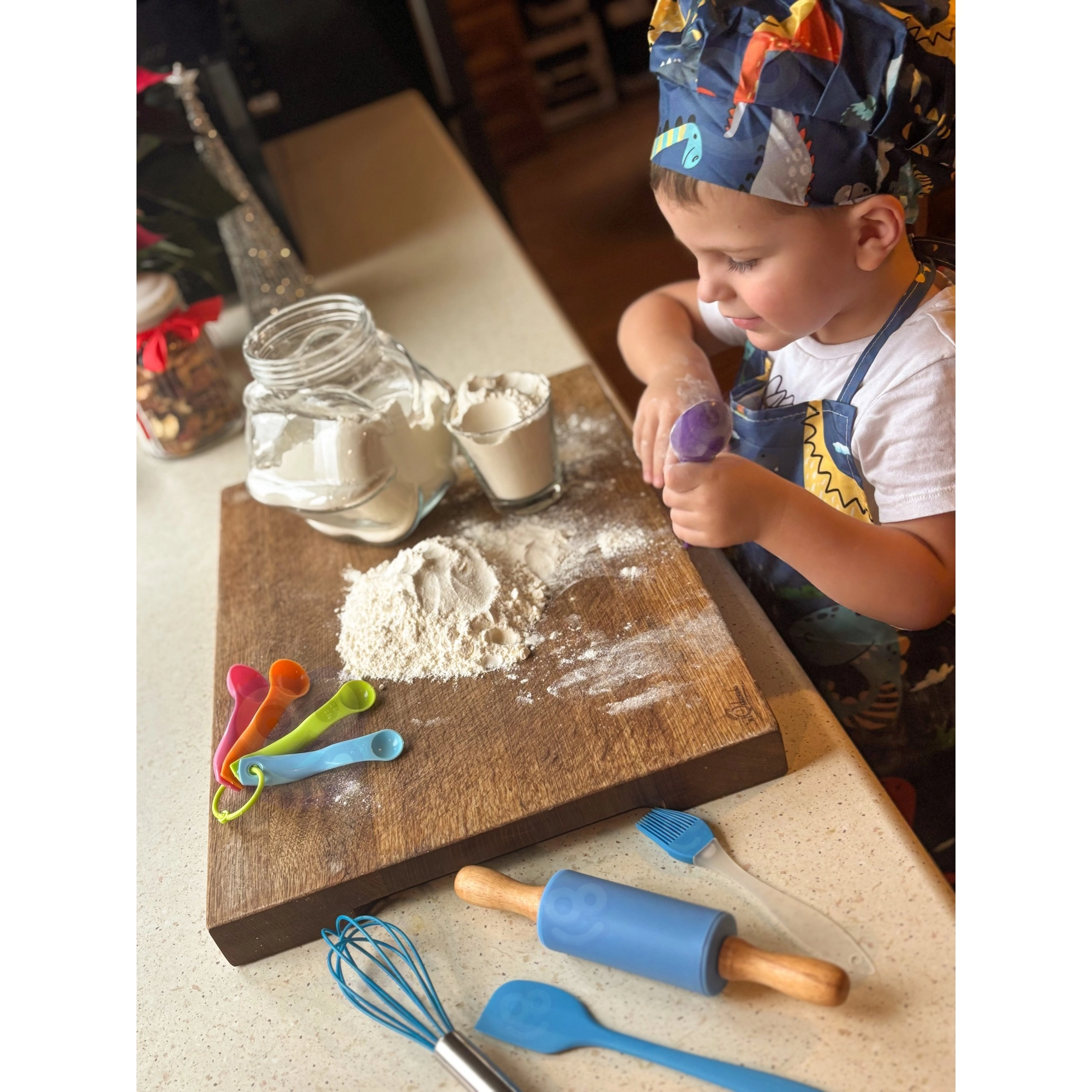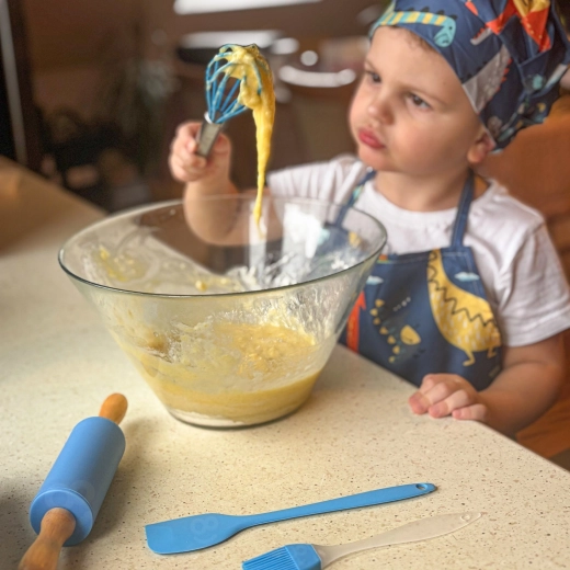 Setul pentru micii bucătari WOOPIE, cu un model vesel cu dinozauri, este ideal pentru primii pași în bucătărie. Datorită bretelei reglabile a șorțului și bonetei elastice, se potrivește perfect; materialele sigure pentru alimente și elementele din silicon sunt rezistente și ușor de spălat. Setul dezvoltă motricitatea fină, coordonarea mână–ochi și creativitatea în timpul gătitului împreună.