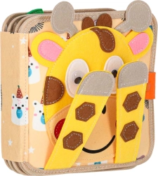 Ghidul acestei lumi fermecate este o girafă simpatică, care pe copertă poate juca „cucu”. În interior te așteaptă pagini tematice: vremea și curcubeul cu asocierea picăturilor, savana cu girafă și plante de explorat tactil, forme geometrice, animăluțe de prins, mijloace de transport mobile, arici cu mere detașabile și buburuză, fructe cu privire la interior și locuitorii copacului cu asociere de culori la căsuțe.