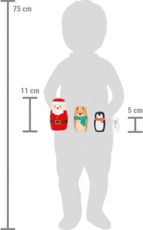 Set adorabil de matrioști din lemn cu motivele Moș Crăciun, ren, pinguin și om de zăpadă aduce atmosferă festivă în orice casă. Copiii și adulții se vor bucura de aranjarea și introducerea figurinelor după mărime, activitate care susține motricitatea fină, coordonarea mână–ochi și concentrarea. Jucăria este în același timp o decorațiune de Crăciun stilată pentru camera copiilor sau living.