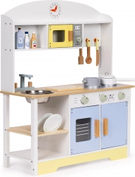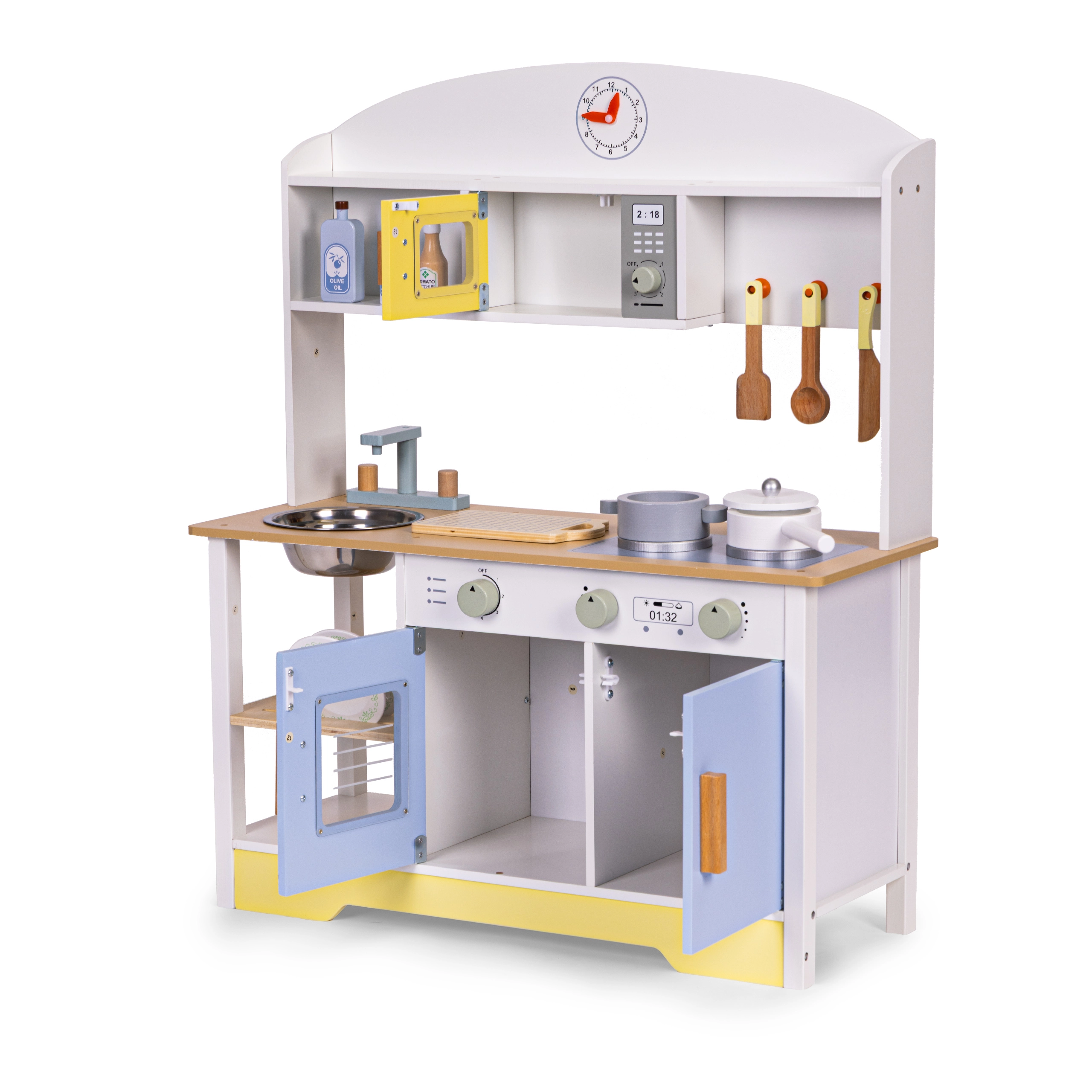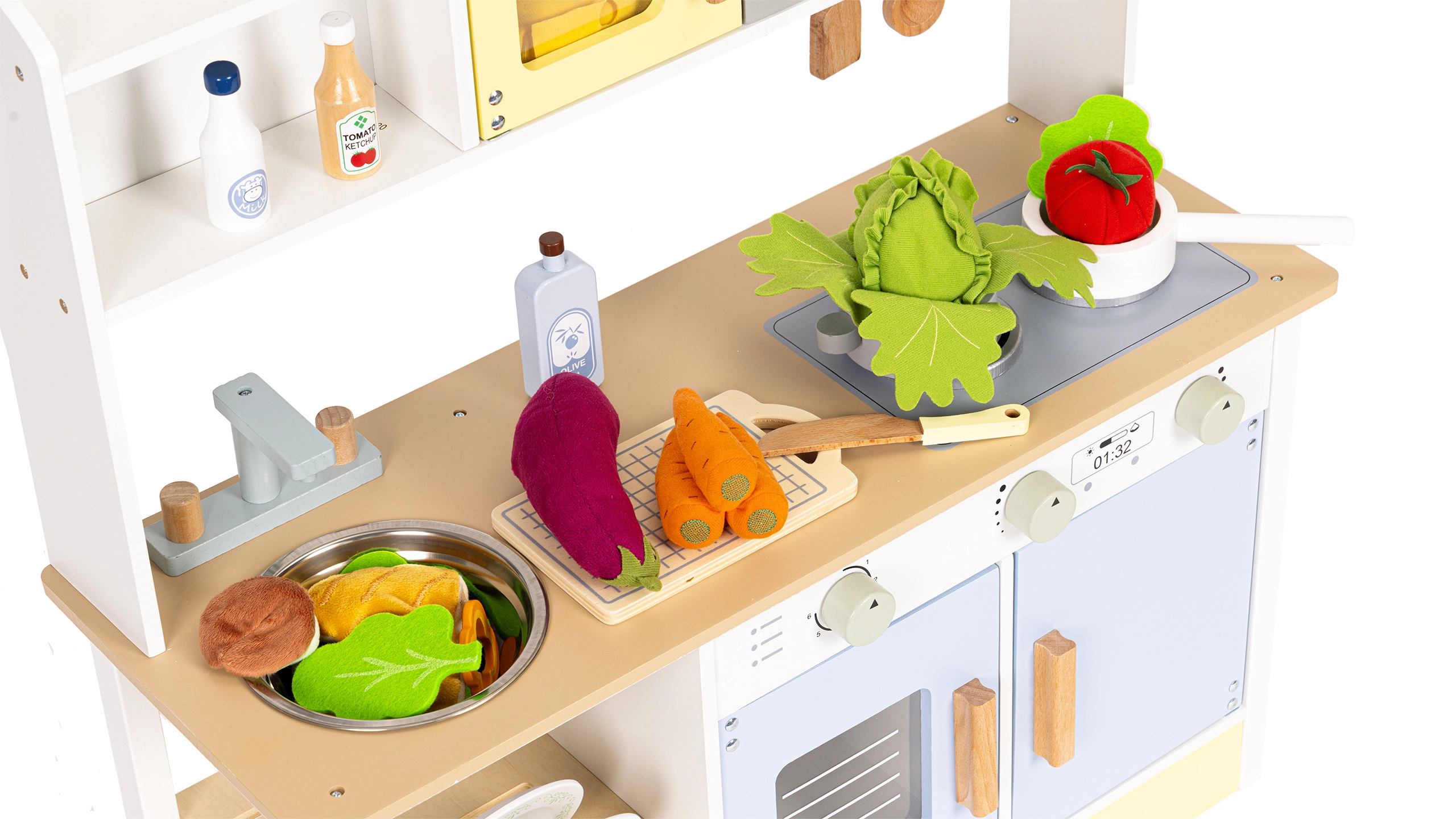 Datorită mașinii de spălat cu selector rotativ, dulăpioarelor și rafturilor practice și ceasului cu ace mobile, bucătăria dezvoltă motricitatea fină, percepția timpului și responsabilitatea. Setul include 12 accesorii din lemn – oală, tigaie cu capac, farfurii, tacâmuri, tocător și sticluțe „ulei de măsline”, „ketchup” și „lapte” – pentru joacă imediată.