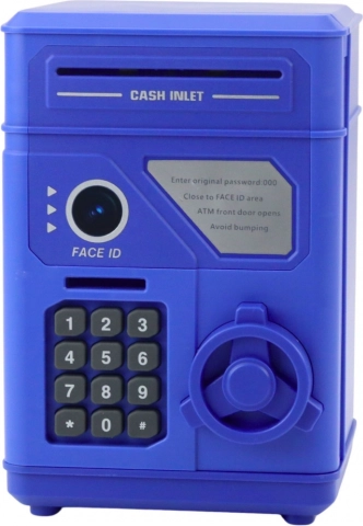 O pușculiță distractivă și educativă în forma unui seif electronic îi învață pe copii să economisească și să gestioneze banii. Oferă tastatură cu cod PIN, introducere automată a bancnotelor și depozitare sigură pentru monede și numerar. Elementul creativ sub forma unei autocolante care imită Face ID stimulează imaginația și transformă economisirea într-un joc plăcut.