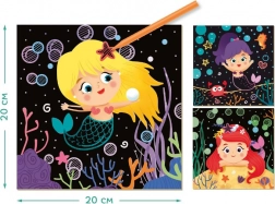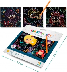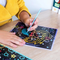 În pachet găsești trei carduri pătrate de 20 × 20 cm și un stilou practic pentru zgâriat. Copiii pot urma liniile sugerate sau își pot lăsa imaginația liberă pentru a crea o lume marină originală.