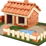 Căsuța finală are acoperiș din țiglă, pereți din cărămidă și curte împrejmuită pe o placă de bază – excelentă pentru expunere și joacă.