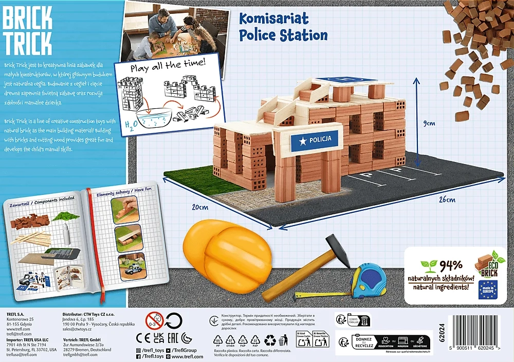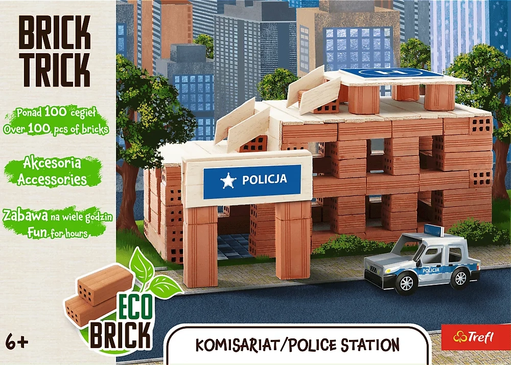 Descoperă setul creativ de construcție Trefl Brick Trick Stație de poliție cu 100 de cărămizi reale din lut și decorațiuni. Copiii și adulții se vor bucura de construcția realistă pas cu pas – de la placa de bază, prin scândurele din lemn, până la decorarea finală. Setul dezvoltă îndemânarea, imaginația și concentrarea și poate fi refolosit datorită adezivului solubil în apă.