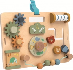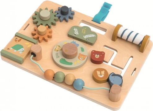 Descoperiți o jucărie distractivă și educativă pentru cei mici: o placă activă în culori pastel delicate cu animăluțe din Safari. Oferă un labirint cu mărgele, roți dințate, plăcuțe rotative și glisante și alte elemente care dezvoltă motricitatea fină, coordonarea mână–ochi și curiozitatea. Datorită decupajului practic se transportă ușor, iar cureaua permite agățarea simplă.