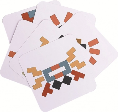 Setul de carduri rezistente cu modele colorate îi ghidează pe copii pas cu pas către soluție. Excelent pentru dezvoltarea imaginației spațiale și a planificării.