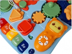 Roți zimțate rotative, glisoare, forme pe șnururi și butoane de apăsat antrenează priza, coordonarea mână‑ochi și gândirea logică.