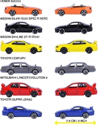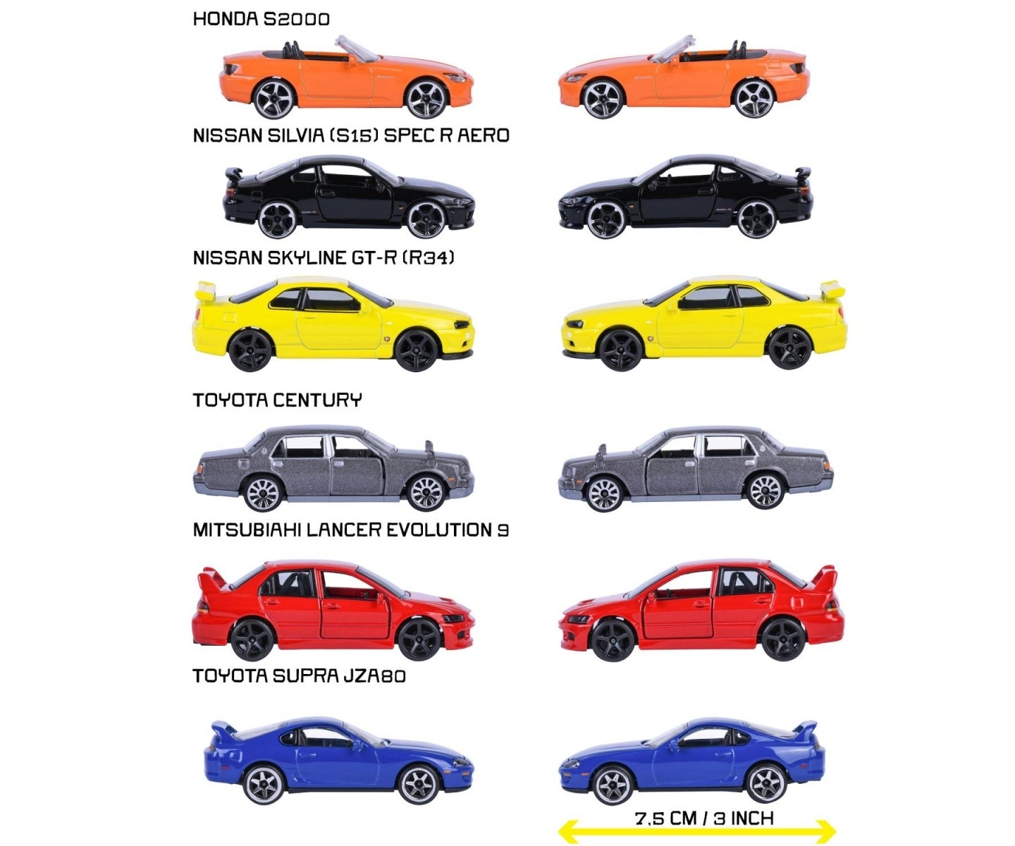 Datorită părților mobile (de ex. uși, capotă sau portbagaj) și roților cu rulare liberă, mașinuțele sunt perfecte atât pentru joacă, cât și pentru expunere de colecție. În pachet poate apărea unul dintre modelele populare ale mărcilor NISSAN, MITSUBISHI, TOYOTA sau HONDA din seria limitată Japan.