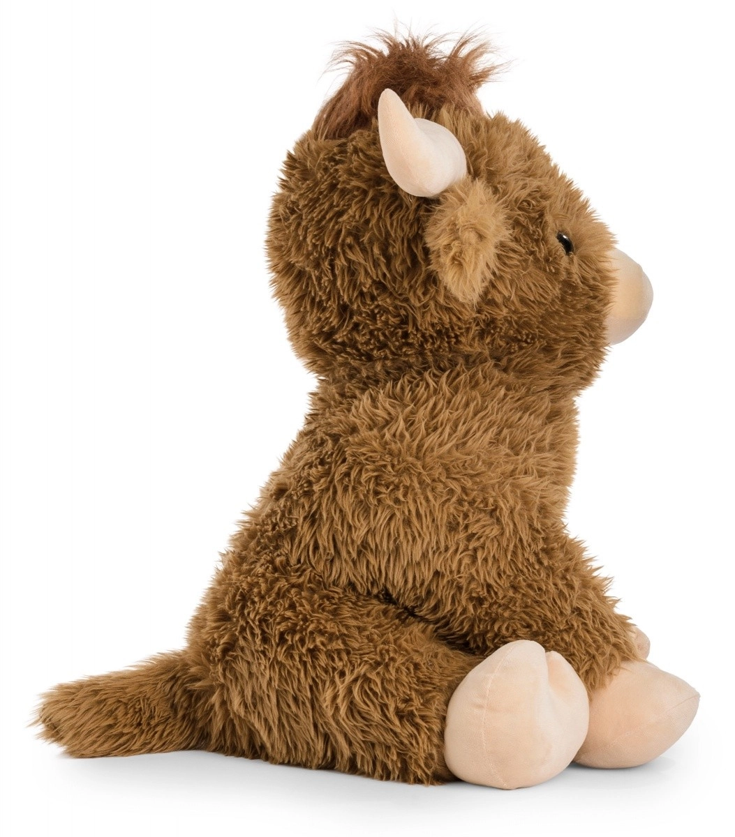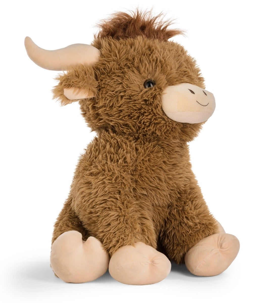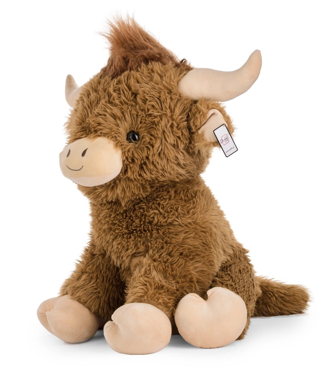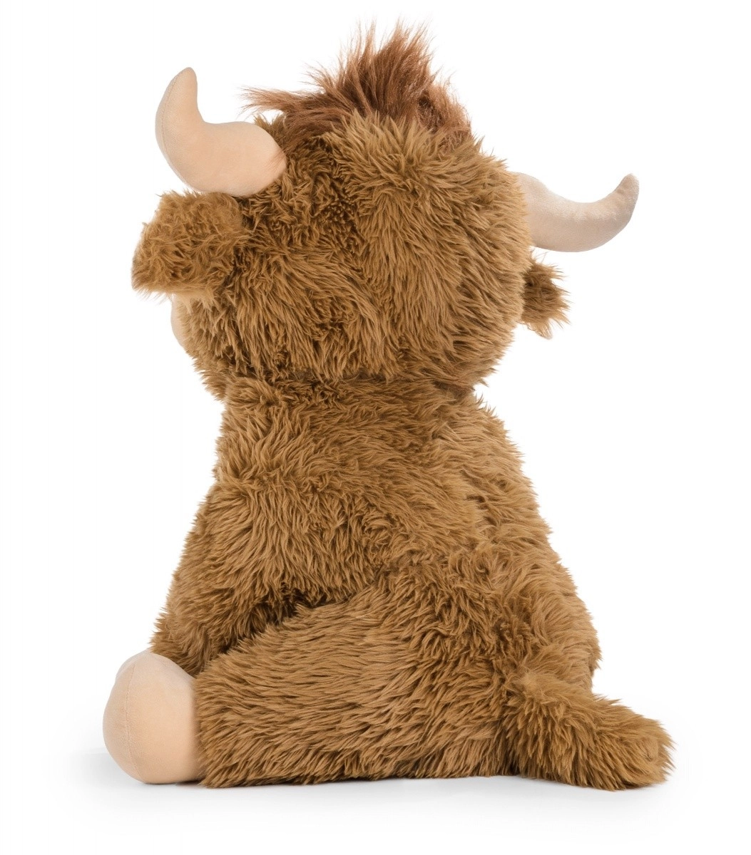 Această văcuță Highland din pluș atrage prin blana sa lungă și pufoasă, coarnele delicate și zâmbetul prietenos. Este realizată din material moale, catifelat, care te îmbie la îmbrățișat, și are o formă stabilă, șezândă, pentru a fi așezată ușor pe pat, raft sau canapea.