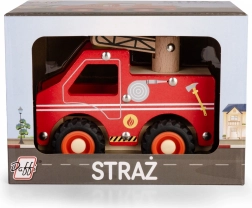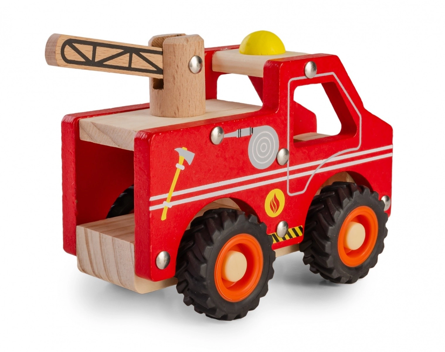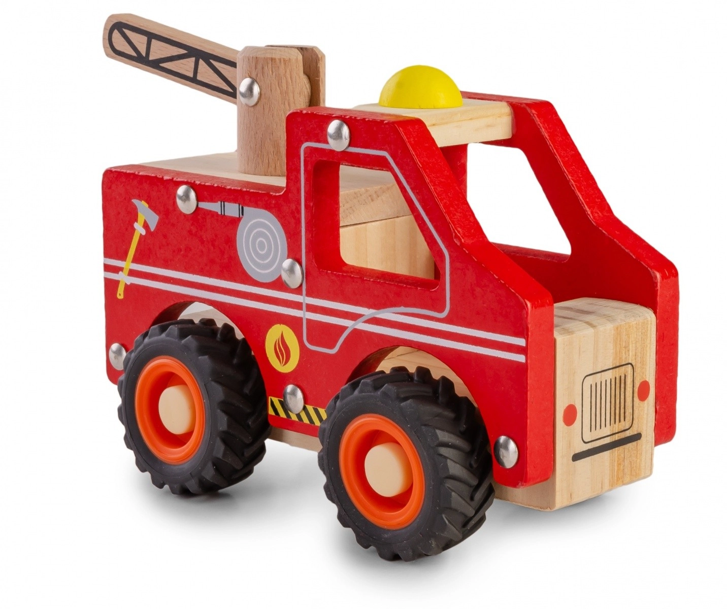 Mașina de pompieri din lemn combină o construcție rezistentă cu un design prietenos. Datorită roților moi din cauciuc, rularea este silențioasă și blândă cu podeaua, în timp ce marginile rotunjite și vopselele netoxice asigură siguranță chiar și pentru cei mai mici.