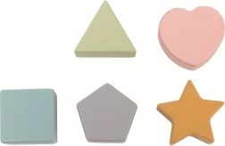 Cinci forme de inserat în culori atrăgătoare îi ajută pe copii să recunoască formele, culorile și să exerseze precizia prinderii și percepția spațială.