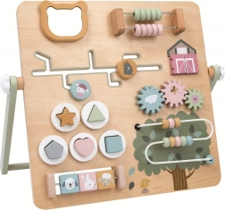 Roți dințate rotative, trasee glisante, labirint cu sârmă și mărgele, precum și un mic abac sprijină motricitatea fină, coordonarea mână–ochi și gândirea logică în timpul jocului.