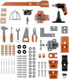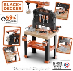 Include set de construcție a unei mașini, pe care micii mecanici o pot asambla în câțiva pași. Bancul conține ciocănel, cheie pentru roți, șurubelniță, cheie plată/deschisă, clește, fierăstrău, clemă mare și șubler, precum și șuruburi, piulițe, cuie și elemente de fixare. Compatibil și extensibil cu toate uneltele BLACK+DECKER de la Smoby.