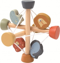 Mingea activă Safari îmbină lemnul de calitate cu elastice flexibile și un design prietenos cu animăluțe (leu, elefant, hipopotam și urs). Copiii își exersează prin joacă prinderea, coordonarea și răbdarea. Culorile pastelate și finisarea netedă atrag atenția și susțin concentrarea.