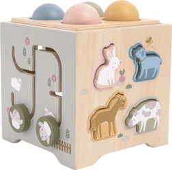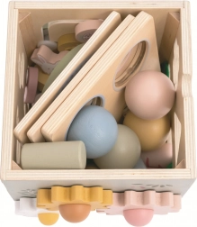 Acest cub motoric din lemn de calitate, cu culori pastelate delicate și ilustrații drăguțe cu animale, stimulează curiozitatea naturală a copiilor. Datorită celor 5 laturi de joc și capacelelor interschimbabile, oferă numeroase modalități de a învăța și de a se distra – de la sortarea formelor și animalelor, la asamblare și rotire, până la primele activități de numărare. După joacă, depozitați simplu toate piesele în interior, astfel încât casa rămâne ordonată.
