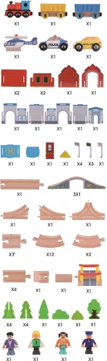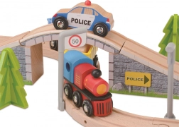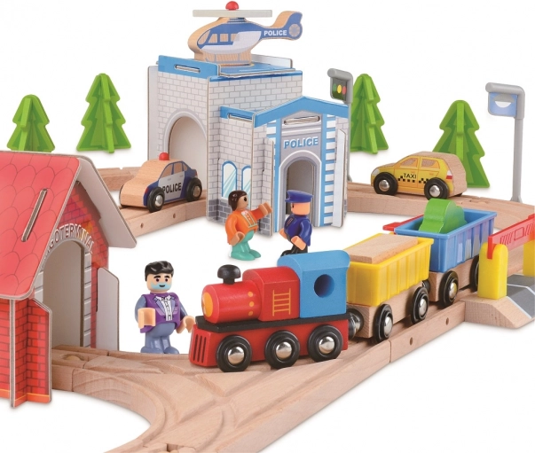 Această cale ferată meticulos realizată oferă o lume completă pe șine: locomotivă cu vagoane, mașini, figurine, secție de poliție, heliport, copaci și indicatoare rutiere. Copiii pot încărca marfa, trece peste podul înălțat, opri la stație și traversa în siguranță trecerea cu bariere. Fiecare cursă se transformă într-o poveste nouă și dezvoltă logica, coordonarea mână–ochi și comunicarea în jocul împreună.
