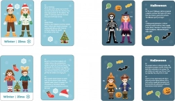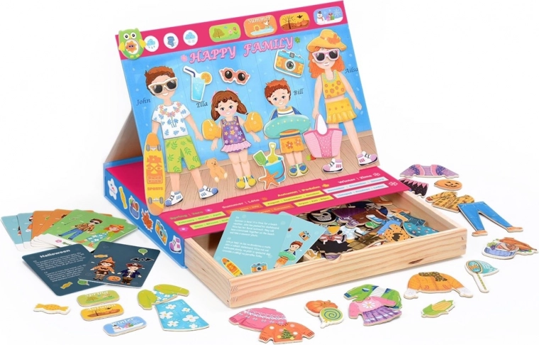 Îmbrăcarea magnetică Familia este un set creativ în care copiii proiectează ținute pentru mamă, tată, fiică și fiu. Datorită gamei variate de haine și accesorii, pot crea outfituri pentru vară, toamnă, iarnă și primăvară și pot îndeplini sarcini distractive de pe cartonașele tematice. Cutia magnetică practică din lemn, cu tablă rotativă, servește drept suprafață de joc și spațiu de depozitare, astfel încât jocul este gata să pornească oriunde cu voi.