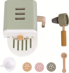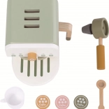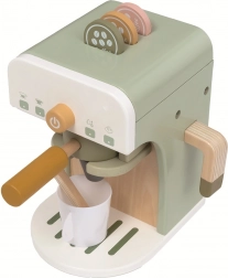 Un espressor stilat din lemn cu pârghie pentru micii barista aduce un joc realist de cafenea, cu accesorii bogate. Copiii aleg între „espresso” sau „cappuccino” datorită celor trei capsule, fixează portafiltrul și „pregătesc” băutura în ceașcă, cu linguriță. Jucăria din lemn natural, în tonuri calde, pământii, dezvoltă imaginația, motricitatea fină, coordonarea și abilitățile sociale și este un accesoriu ideal pentru orice bucătărie de jucărie.