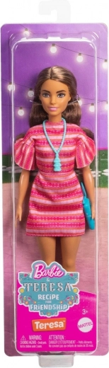 Păpușa Teresa arată exact ca în filmul BARBIE și TERESA: Rețeta prieteniei – poartă o rochie roz cu model și mâneci cu volănașe, pantofi albi și accesorii turcoaz îndrăznețe. Datorită detaliilor atent lucrate ale ținutei și machiajului, este pregătită pentru orice aventură de modă.
