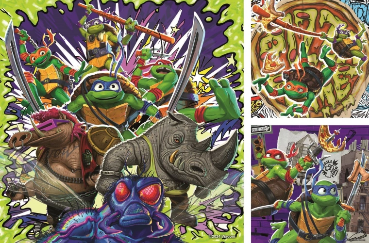 Puzzle pentru copii cu motivul Ţestoasele Ninja de la RAVENSBURGER oferă trei puzzle-uri separate a câte 49 de piese, ideale pentru dezvoltarea răbdării și a concentrării. Fiecare imagine asamblată are dimensiunea de aprox. 21 × 21 cm și este realizată din carton de calitate, rezistent, pentru o îmbinare precisă și ușoară.