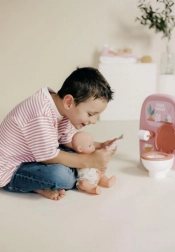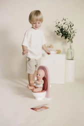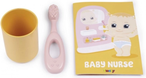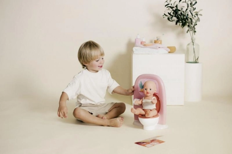 Setul de baie elegant pentru păpuși din gama Baby Nurse oferă tot ce este necesar pentru îngrijirea zilnică. Include o toaletă, un lavoar cu oglindă, o rolă de hârtie igienică și accesorii precum periuță de dinți și pahar. Potrivit pentru păpuși de până la 42 cm și fabricat din cel puțin 75% material reciclat.